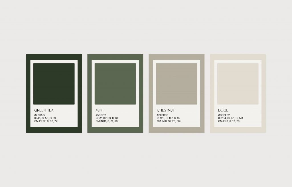 Logo typographique épuré, palette enrichie de tons terreux, typographie géométrique et serif élégante.