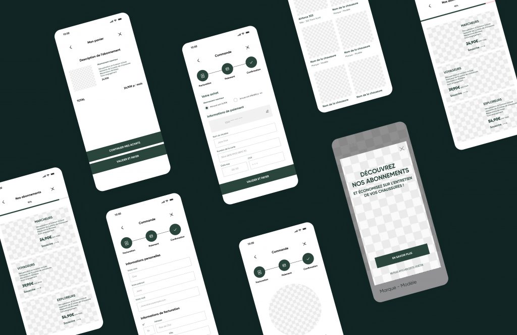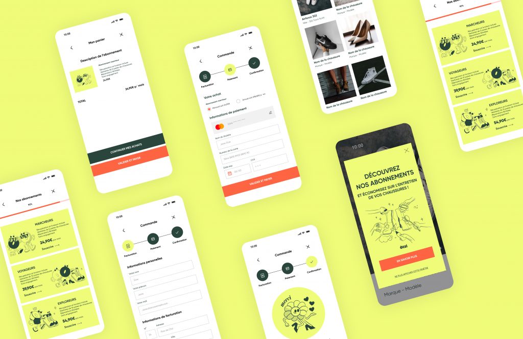 Conception des maquettes UX/UI pour l’application mobile d’Otzi, une conciergerie de chaussures entièrement digitale proposant des abonnements d’entretien et de réparation.